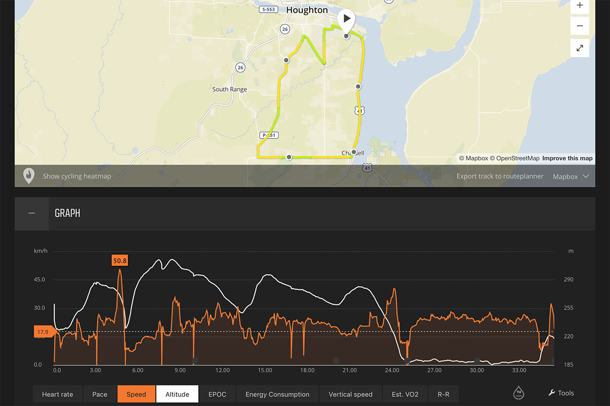 Here comes the summary and map of this last ride in June. The closed road changed my plan. But it did not prevent me to arrive in Chassell. It was just a little longer than I planed. The average riding speed was 17.9 km/h. The max riding speed was 50.8 km/h. It was a new route to visit Chassell.